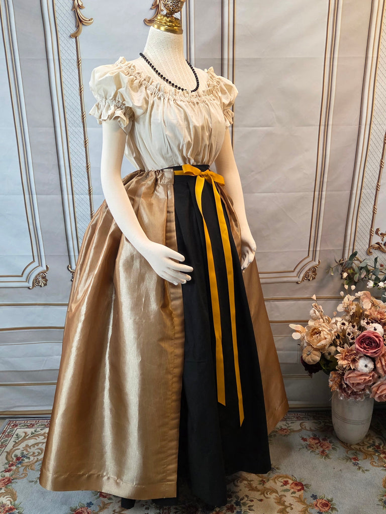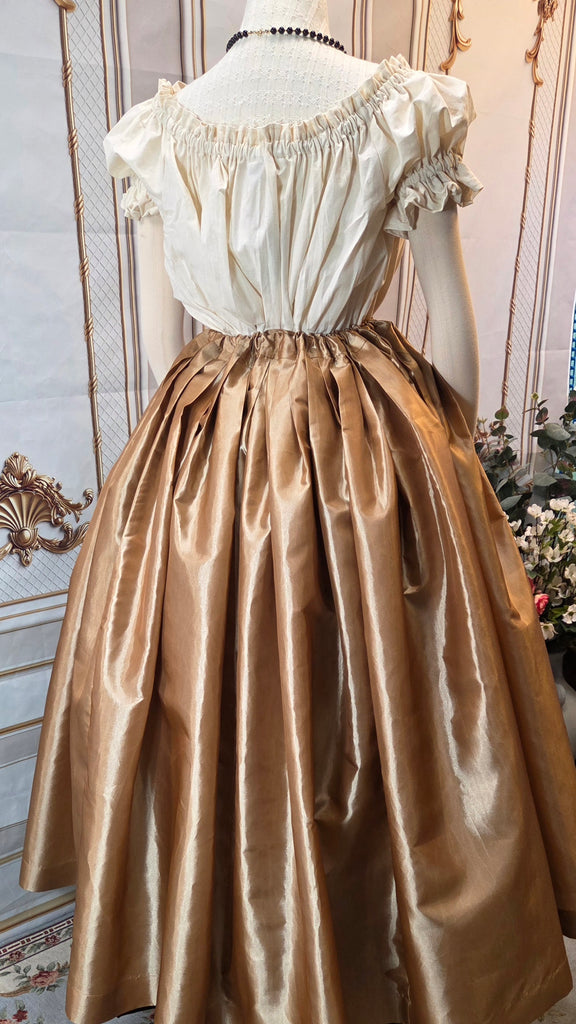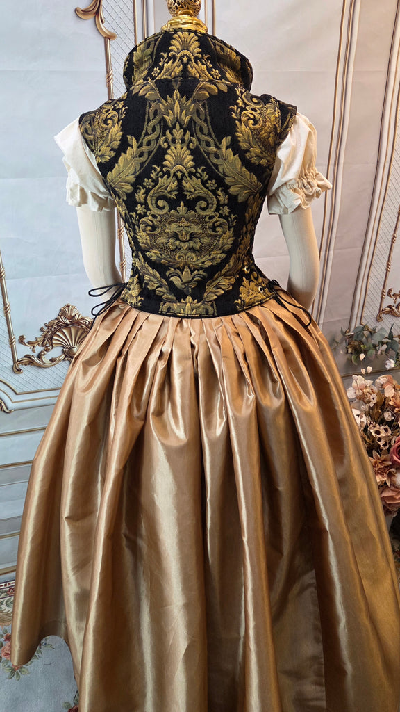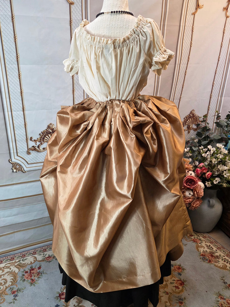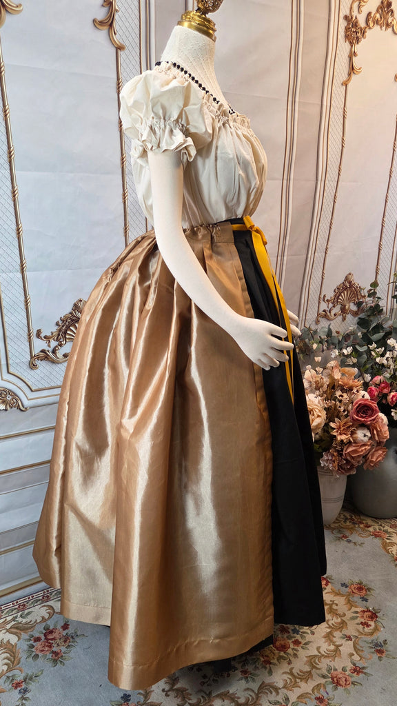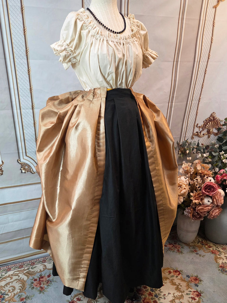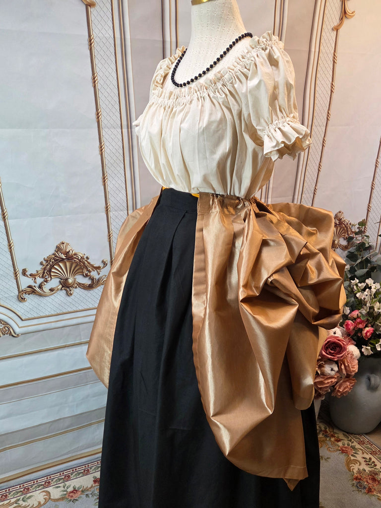 This stunning self-bustling overskirt is made from 4 yards of high-quality silky fabric, available in your choice of colors. It can be worn in various ways and features four rows of adjustable bustle ties, allowing you to create the perfect look for any occasion. Additionally, it is pleated into a drawstring waistband for full adjustability to match your desired style.