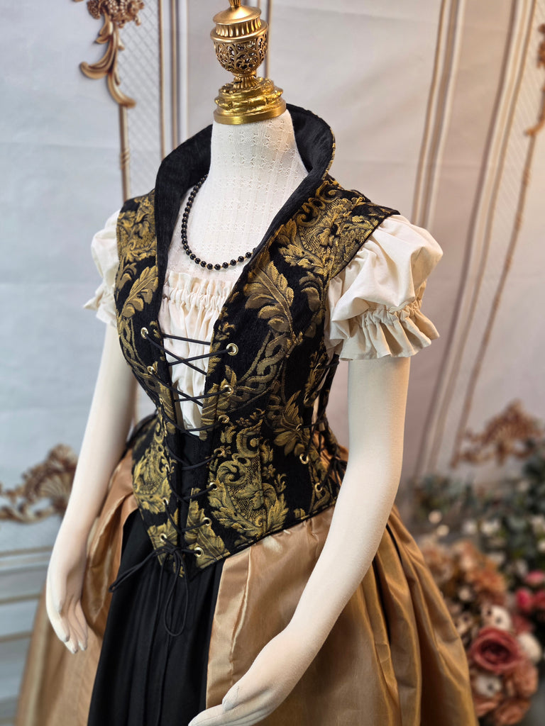 It is styled here with a Cream short ruffled sleeve chemise, a gold taffeta self-bustling over skirt, and a black cotton pocket skirt (Not Included).