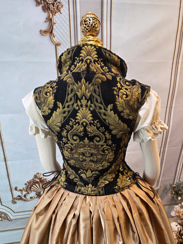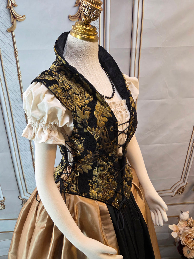 Proudly handmade in Independence, Iowa, our Elizabethan Riding Jackets are crafted with meticulous attention to detail. This jacket features front and side lacing secured by durable, professional-grade grommets. Made from Black and Gold chenille brocade upholstery fabric, it includes a Black solid chenille collar that also serves as the reversible side of the jacket. You can style it with either the gold brocade or the solid black side. The jacket incorporates steel boning for strong support.