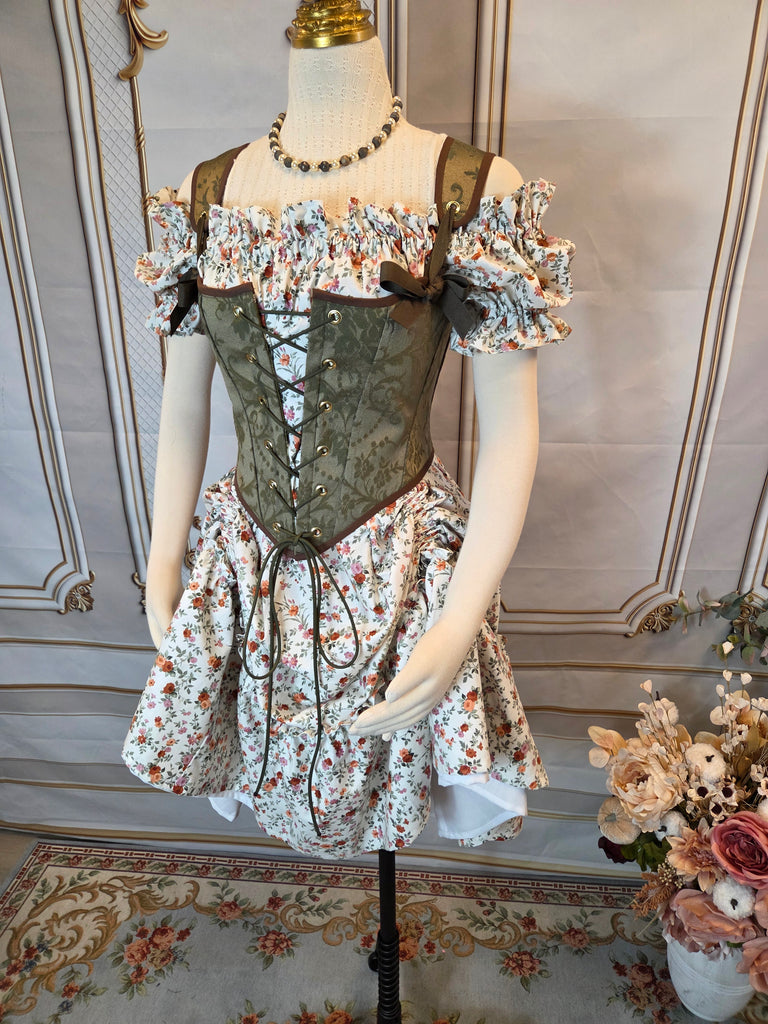 Introducing the Cottage Bodice, handmade in Independence, Iowa. Inspired by the cottage-core style, this bodice features a short design that can be worn with a frilly skirt or one of our tea-length chemises to complete your cottage-core look. Each piece is meticulously crafted in a beautiful olive green jacquard fabric and trimmed with contrasting brown bias tape.