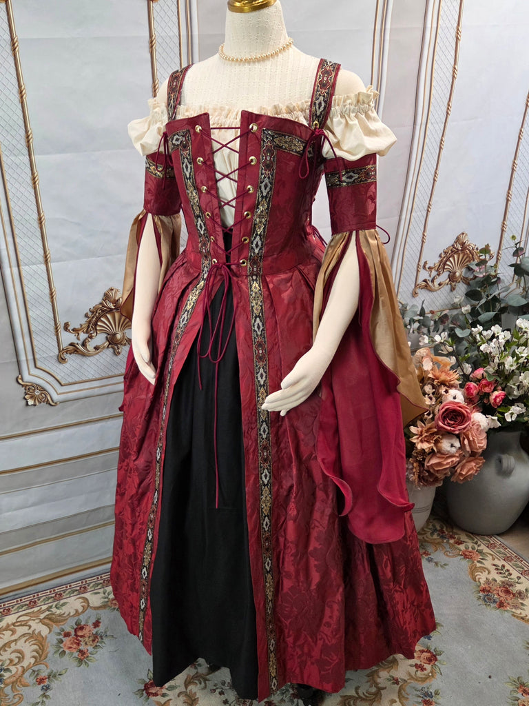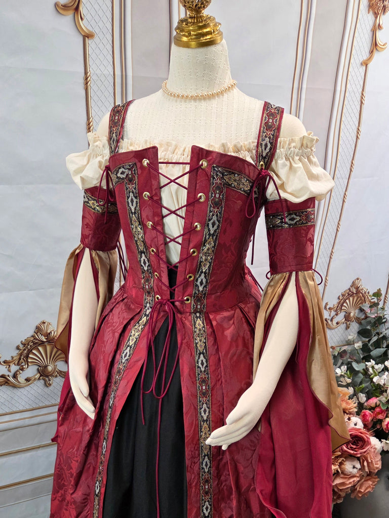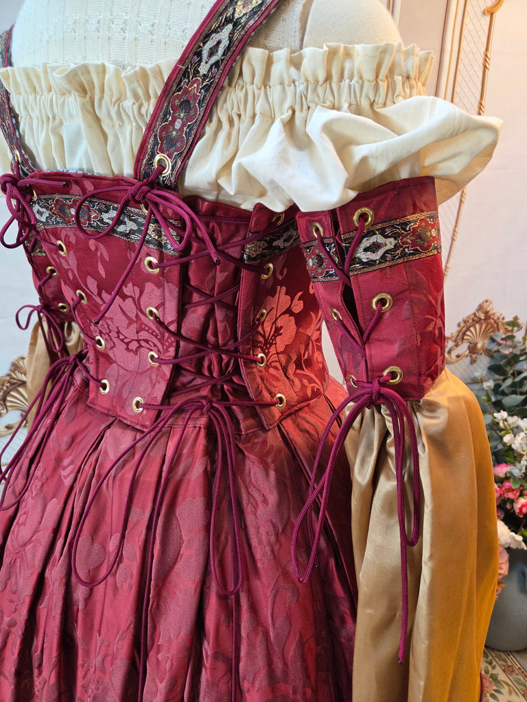 Venetian Courtesan Gown - Burgundy Silk Jacquard Black and Gold Trim