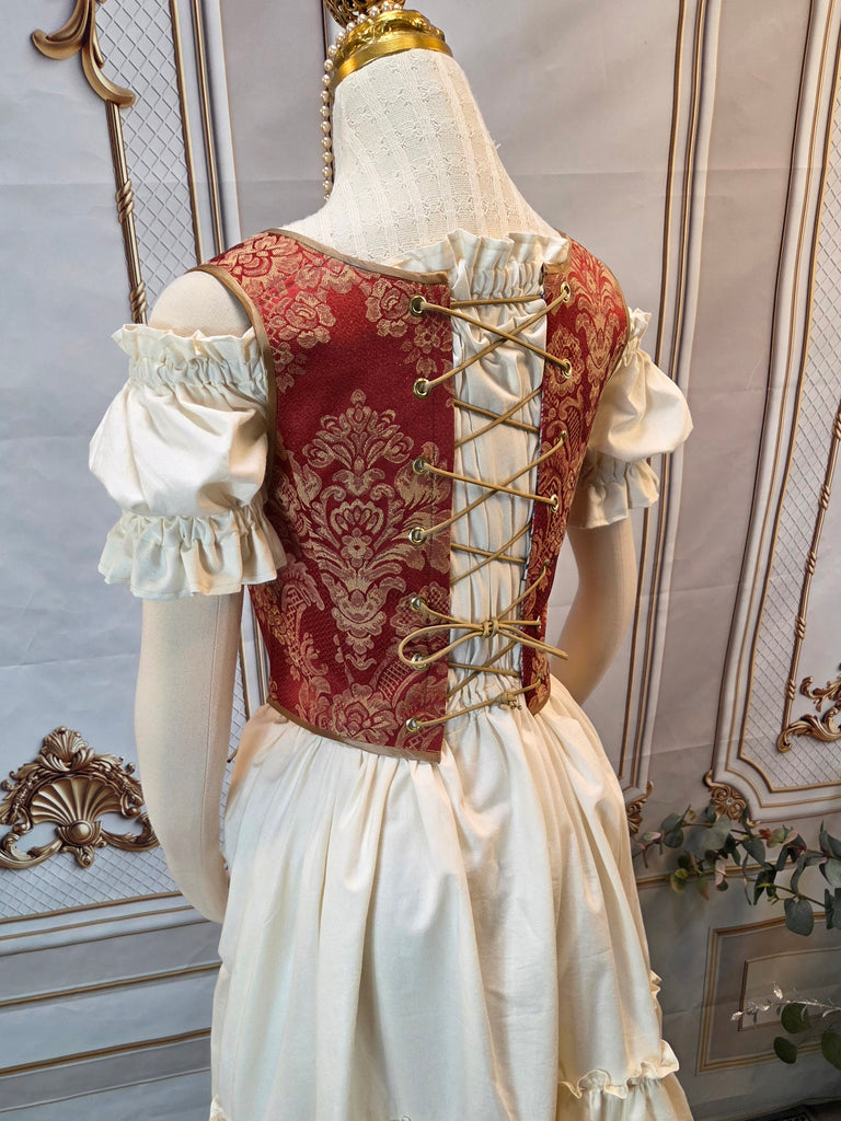 Introducing the Cottage Bodice, handmade in Independence, Iowa. Inspired by the cottage-core style, this bodice features a short design that can be worn with a frilly skirt or one of our tea-length chemises to complete your cottage-core look. Each piece is meticulously crafted in a beautiful red and gold brocade fabric and trimmed with contrasting gold bias tape.