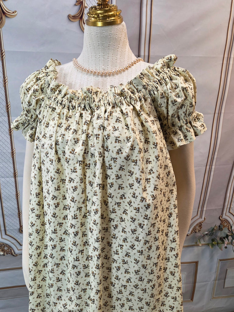 Chemise - Hip Length - Ruffled Short Sleeve - Cream with Green Floral Print