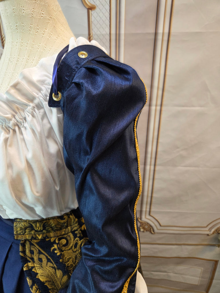 Handcrafted in Independence, Iowa, these Elizabethan sleeves are made with meticulous attention to detail. Constructed with polyester dupioni and lined with taffeta, these sleeves are lightweight and comfortable. Featuring a small puff at the top and open below the elbow to allow your chemise to puff out. 2 metal buttons with ribbon loops close at the wrist.
