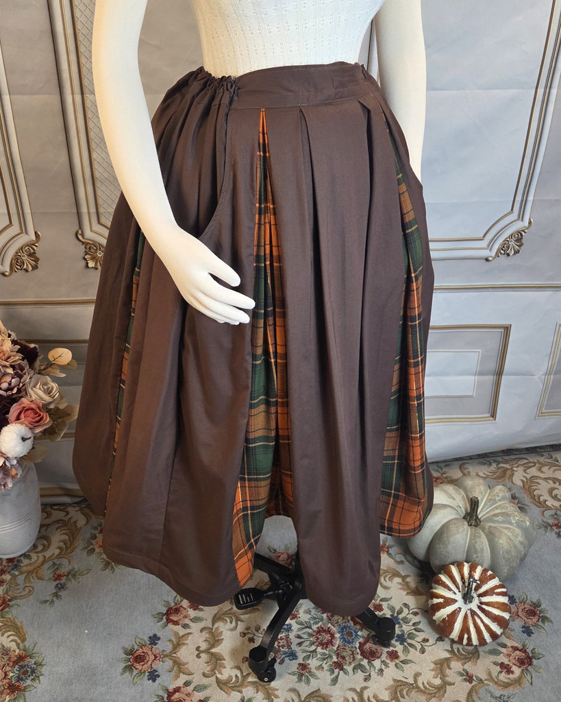 Midi Box Pleated Skirt - Tea Length Drawstring Skirt with Pockets Fall Plaid and Brown