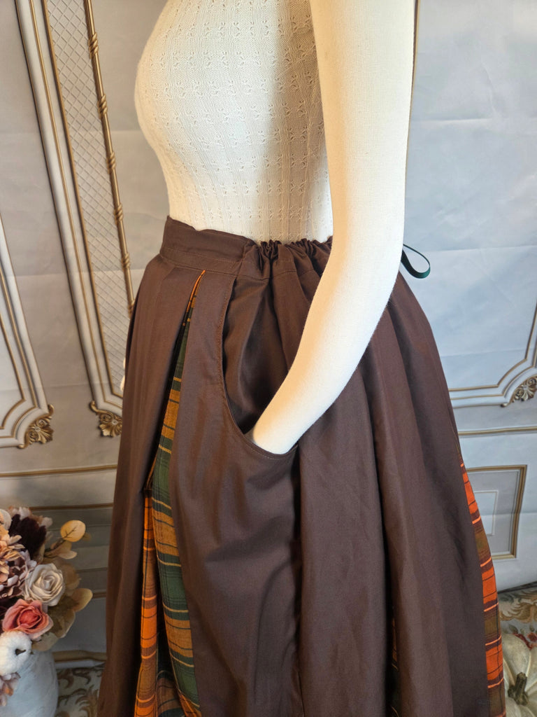 This beautiful skirt is made from 5 yards of 100% woven cotton fabric, handcrafted in Independence, Iowa. The unique design features box pleats in chocolate brown with a beautiful fall-themed plaid inset throughout, creating an eye-catching pattern. It is pleated into a 70-inch waistband, which is flat in the front and gathers at the back with a ribbon drawstring. This design has a full skirt that is perfect for twirling, while maintaining a slim waistline. The skirt hem includes a horsehair braid to give a full, flared shape. All seams are serged to prevent fraying.